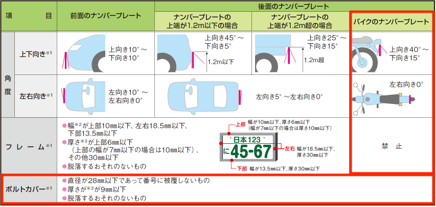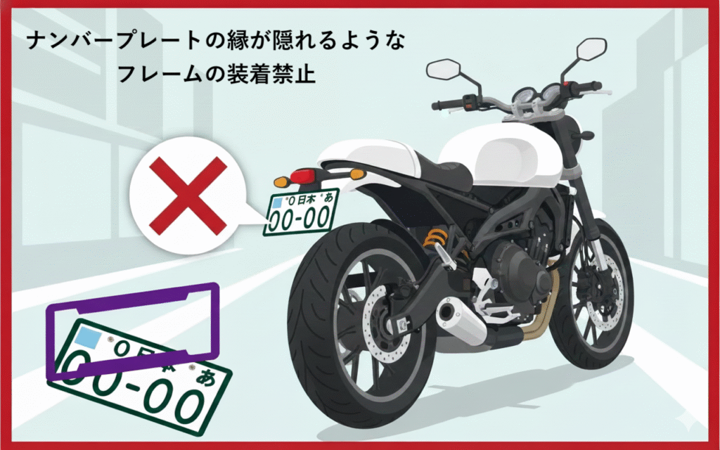 | フレーム | ナンバープレートへのフレームの取り付け自体が禁止。ただし、ナンバープレートの背面に取り付けるバックプレートタイプは違反にならない。 |